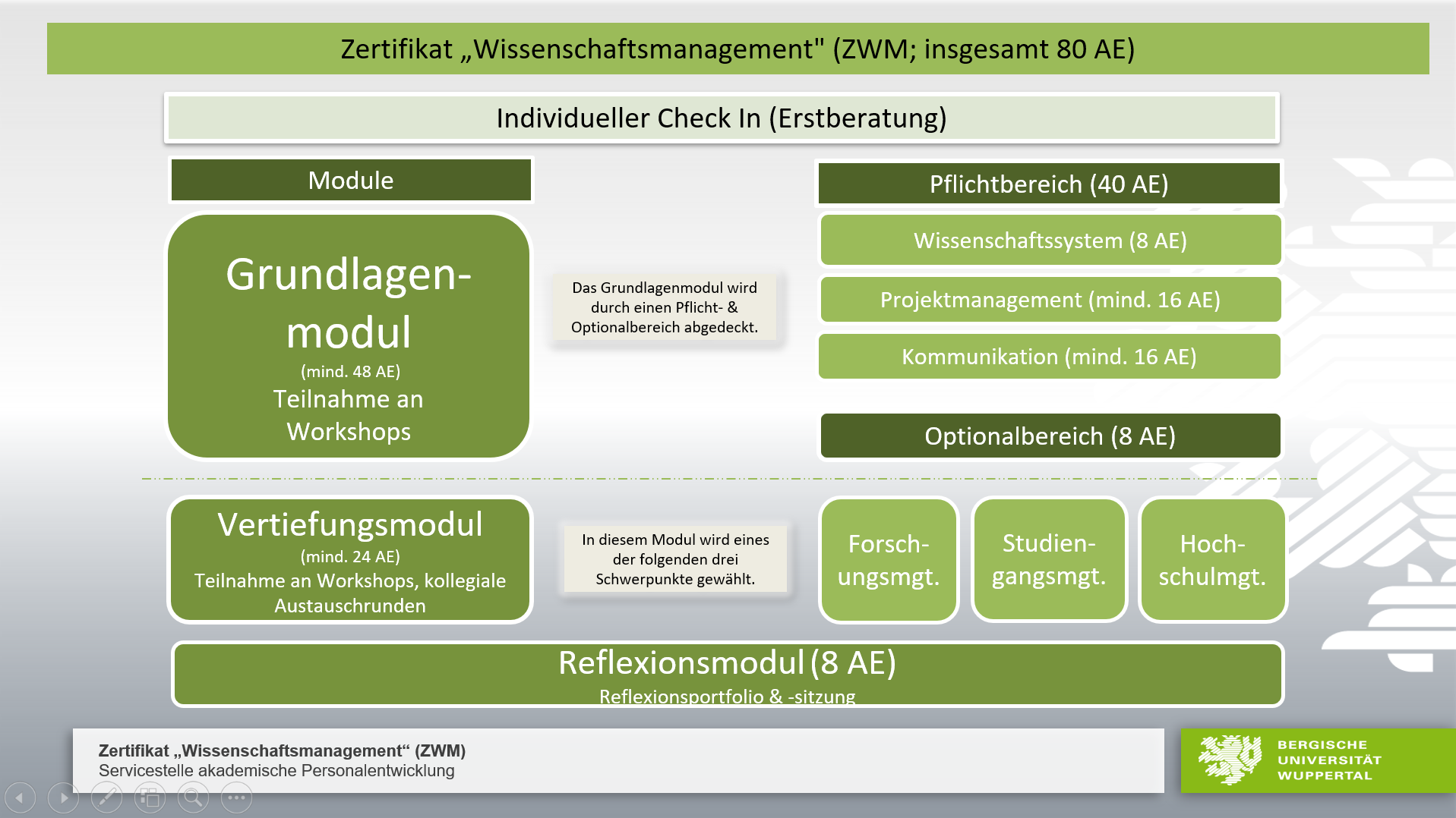 Das Zertifikatsprogramm „Wissenschaftsmanagement (ZWM)“ bereitet Beschäftigte der BUW auf verantwortungsvolle Aufgaben im Wissenschaftsmanagement an Hochschulen, außeruniversitären Forschungseinrichtungen und Wissenschaftsorganisationen vor. Ziel ist es vor allem, praxisnahe Kompetenzen für die Arbeit „zwischen Baum und Borke“ im Kontext von Studium, Forschung und Selbstverwaltung an Hochschulen zu vermitteln. Aufgaben im Wissenschaftsmanagement können z.B. Begleitung und Unterstützung in Akkreditierungsverfahren, Projektmanagement in Drittmittelprojekten oder Dekanaten sowie Studienfachberatung sein.